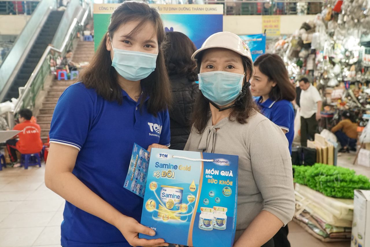 Trong điểm đến đầu tiên vào hai ngày mùng 6 và mùng 7/3, tại chợ Hà Đông, hàng trăm hộp sữa Babyme Gold, hàng trăm hũ nước yến cho trẻ em Babyme Nest, nước yến cho người lớn Samine Nest cũng như hàng trăm hộp sữa bột dinh dưỡng Samine Gold cho người cao tuổi đã được đón nhận.