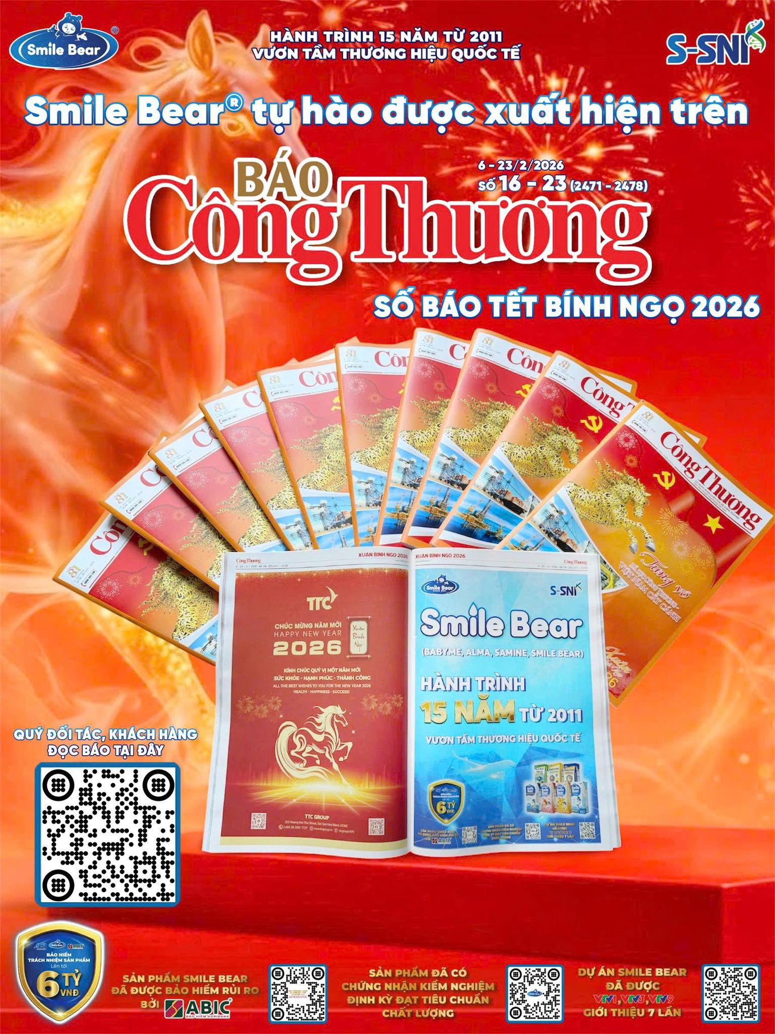 Smile Bear® vinh dự được xuất hiện trên Báo Công Thương – Ấn phẩm Tết Bính Ngọ 2026, sánh cùng nhiều tập đoàn, doanh nghiệp tiêu biểu thuộc các lĩnh vực ngân hàng, doanh nghiệp Nhà nước, doanh nghiệp tư nhân và doanh nghiệp có vốn đầu tư nước ngoài.