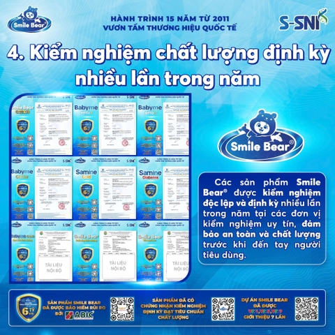 Sản phẩm Smile Bear được kiểm nghiệm độc lập tại các đơn vị kiểm nghiệm uy tín, đảm bảo an toàn trước khi đến tay người tiêu dùng.