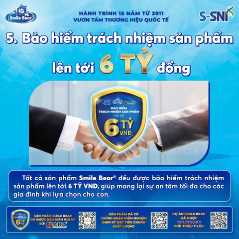 Tất cả sản phẩm Smile Bear đều được bảo hiểm trách nhiệm sản phẩm bởi ABIC, mang lại sự an tâm tối đa cho các gia đình.