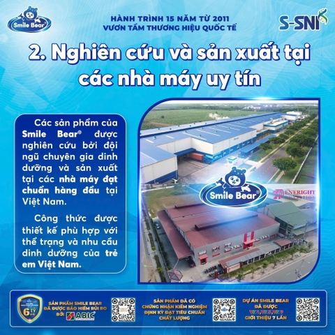 Các sản phẩm Smile Bear được nghiên cứu bởi đội ngũ chuyên gia dinh dưỡng và sản xuất tại các nhà máy đạt tiêu chuẩn cao trong ngành.